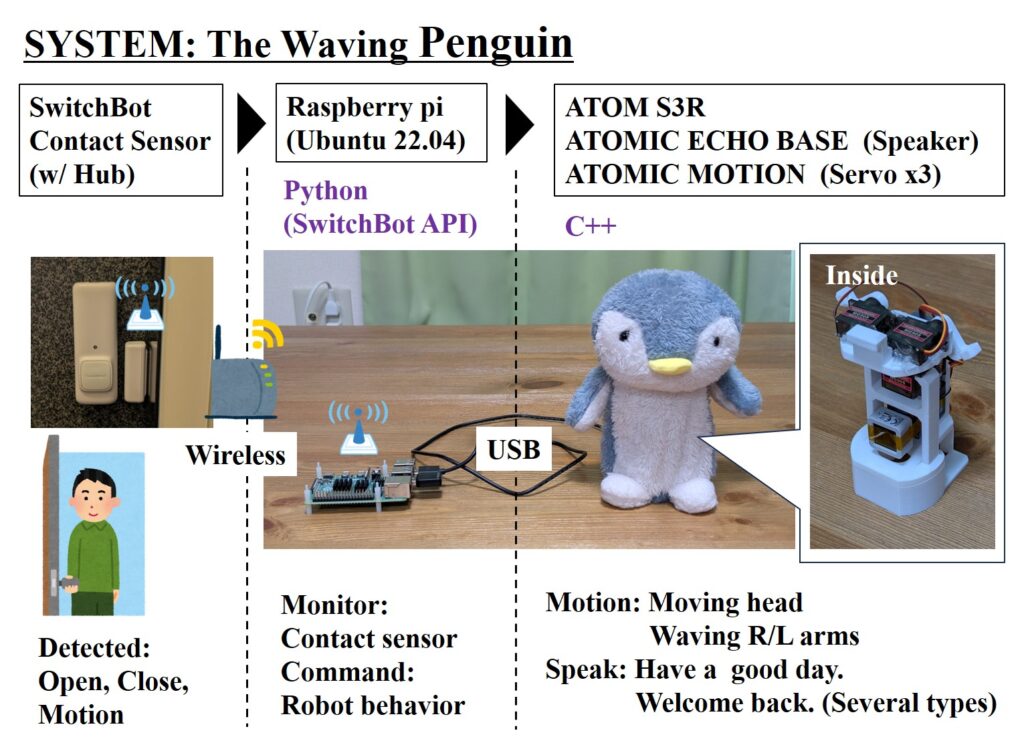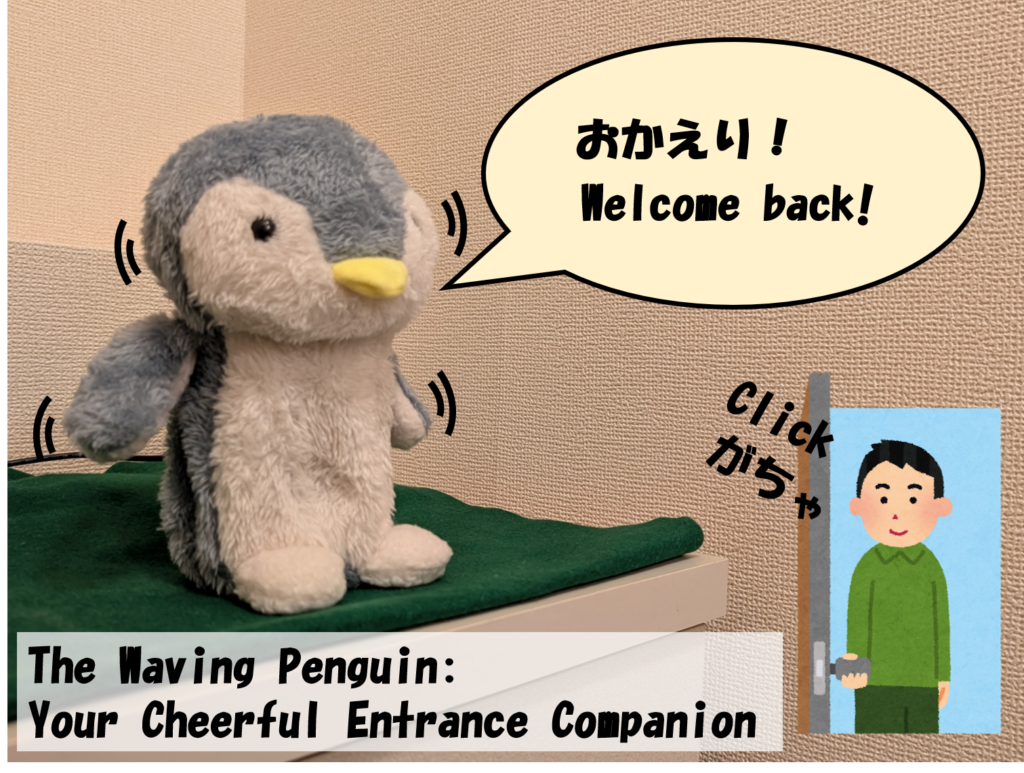 家への出入り時に、ぬいぐるみが元気よく動きながら話しかけてくれるロボット。Switch BotのAPIを使い、Raspberry piとM5Stack Atomを使って実現。腕をパタパタしてくれるだけでも可愛らしい。やわらかい布を違和感なく動かすのが難しいところ。