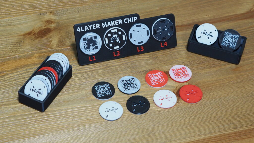4枚の部品を重ねることでQRコードを作ったメイカーチップ。多色刷りの3Dプリンタで作られることが多いメイカーチップを、あえて1色刷りの3Dプリンタ(Creality K1初期型)で4部品に分けることで実現。段差のある少し立体的なQRコードの見栄えになったのは面白い。ノズル径は0.2mmで、QRの誤り訂正を最大にしたのがポイント。